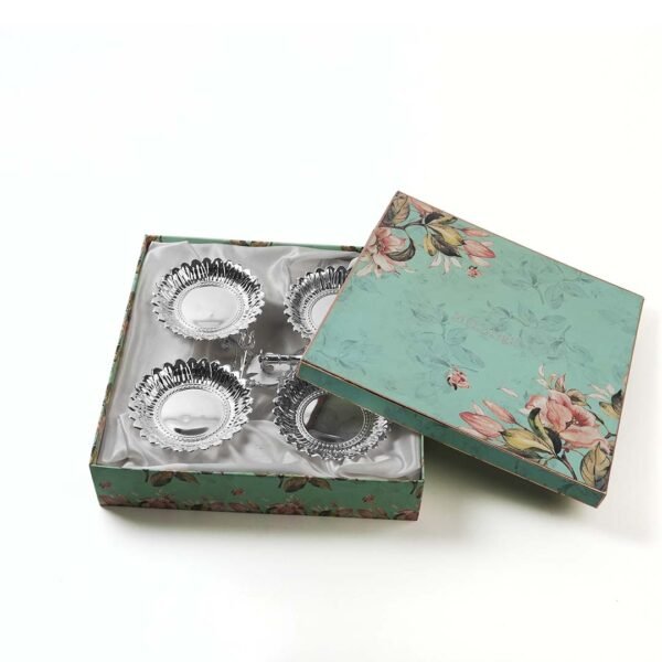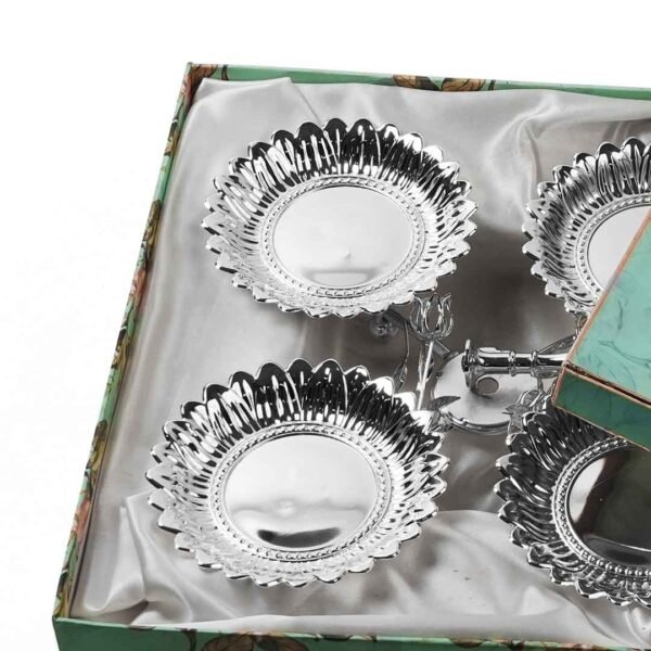 Crafted with finesse, this Sunflower Shaped 4-in-1 Silver Bowl Stand has an assured quality that makes it a remarkable gift. Being a highly unique article, the silver plate fruit bowl is a multi-purpose art piece. The four different bowls make it highly useful for serving different edibles at once. Alongside, the magnificent design of the centerpiece gives it an immensely luxurious look. Apart from using it for serving purposes, this can easily pass as a decor piece for tables. One can use their own creativity and imagination to make the best use of this German silver big bowl stand.