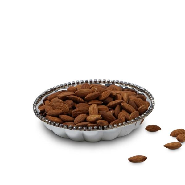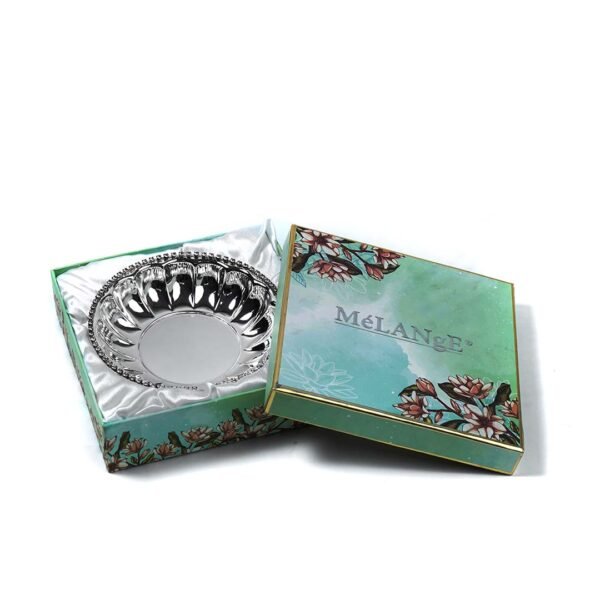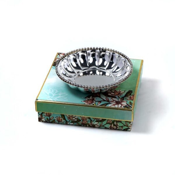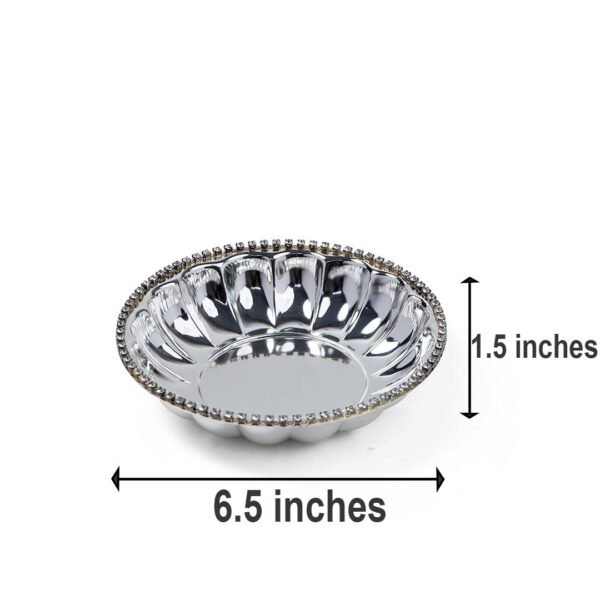 To make sure that the recipient is pleased by your present, one needs to look for two qualities in a gift. One, that the gift should be useful to the recipient. Two, that the gift should be of good quality and be highly classy. If a gift possesses these two qualities, it is surely to be cherished by the receiver. Our Ribbed Body Crystal Rim German Silver Bowl makes one such perfect gift. Its ribbed body gives a modish and contemporary appearance, while the crystals on the rim make it more blingy. Moreover, the round shape and big size makes it ideal to serve dry fruits, chocolates, sweets, etc. Therefore, making sure that the gift doesn’t end up being stashed.