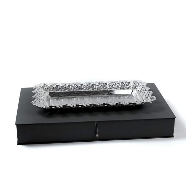 Expertly silver-plated, this Grape Leaf Cutwork Rectangle Silver Tray radiates sophistication with its intricate grape leaf cutwork along the borders, adding a touch of elegance and refinement to any setting. Whether used as a table centrepiece, for serving guests, or as a decorative keepsake, the rectangle silver plate has an unmistakable allure.