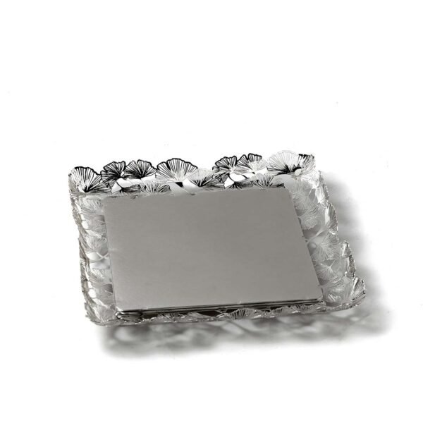 Flamboyant Petals Cutwork Square Flat Silver Tray is a stunning platter that effortlessly speaks of contemporary design and sophistication. Its intricate cutwork pattern, inspired by the blooming petals of the Flamboyant, beautifully adorns the side of the tray giving it a unique look. The square shape and flat design make it both aesthetically pleasing and functional for a variety of uses.