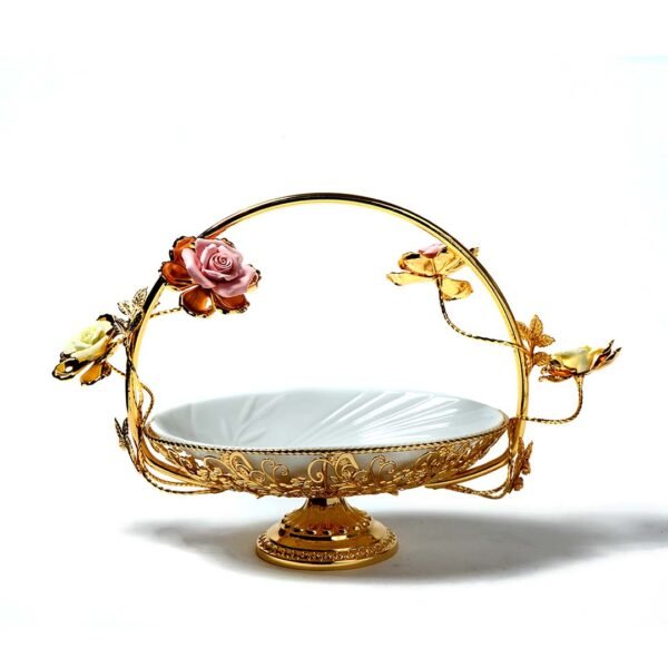 Oval Golden Dry Fruit Basket with Ceramic Bowl and Decorative Flowers