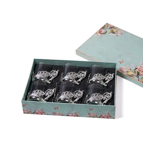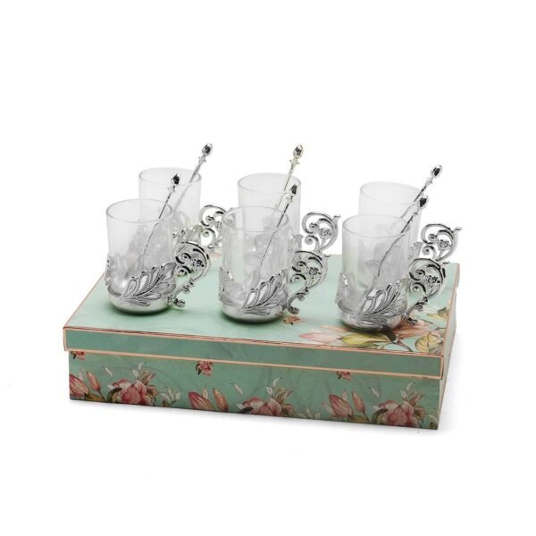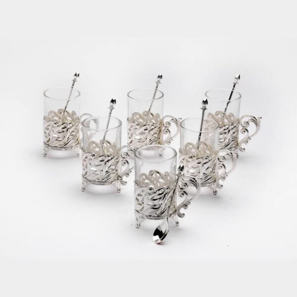 Experience royalty in every sip with Melange’s Classic Designer Glasses with Spoons (Set of 6). Each mug is encased in an intricately designed silver-plated holder, featuring delicate scrollwork and an opulent finish. The luxurious appeal makes this silver plated glass set a must-have for those who appreciate the finer things in life.