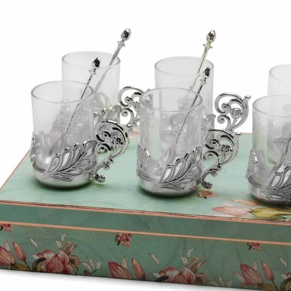 Made with high-quality glass, it’s perfect for both hot and cold beverages—retaining heat or chill while letting you enjoy the look of your drink making these mugs a statement piece in any setting. Paired by matching silver-plated spoons, this set is ideal for hosting luxurious tea parties, intimate gatherings, or simply elevating your everyday coffee moments. Designed to impress, these mugs bring a regal touch to your home and dining experience.
