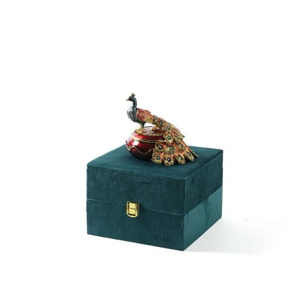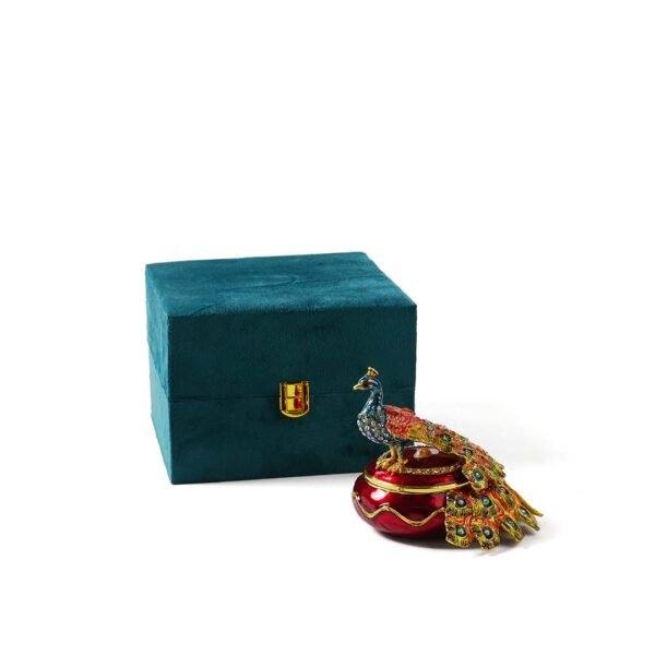 The peacock is accentuated with shimmering embellishments that catch the light from every angle. Each feather of the peacock’s majestic tail is intricately detailed with gemstone-like accents, creating a lifelike and glamorous finish. The base of the box is equally striking, with a high-gloss maroon enamel and delicate golden trims that elevate the entire look.