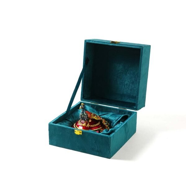 A luxurious blend of functionality and decor – the box opens up to reveal a compact inner compartment – perfect for storing dry fruits, spices like cardamom, trinkets, or as a silver earring box. Whether placed on a coffee table, dressing table, or console, it effortlessly enhances the space with its rich color palette and ornate charm.