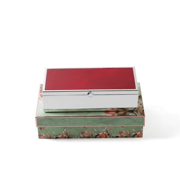 Bold, beautiful, and brimming with charm—the Red Enameled Rectangle Silver Box is a stunning blend of vibrant color and timeless sophistication. The deep red enamel adds a luxurious pop of color that’s both regal and romantic, making it perfect for festive gifting, heirloom storage, or simply elevating your dresser décor. Encased in a sleek silver-plated body, its rectangular silhouette is clean, modern, and striking from every angle. This isn’t just a silver plated box—it’s an artistic expression designed to hold what’s precious while looking effortlessly graceful.